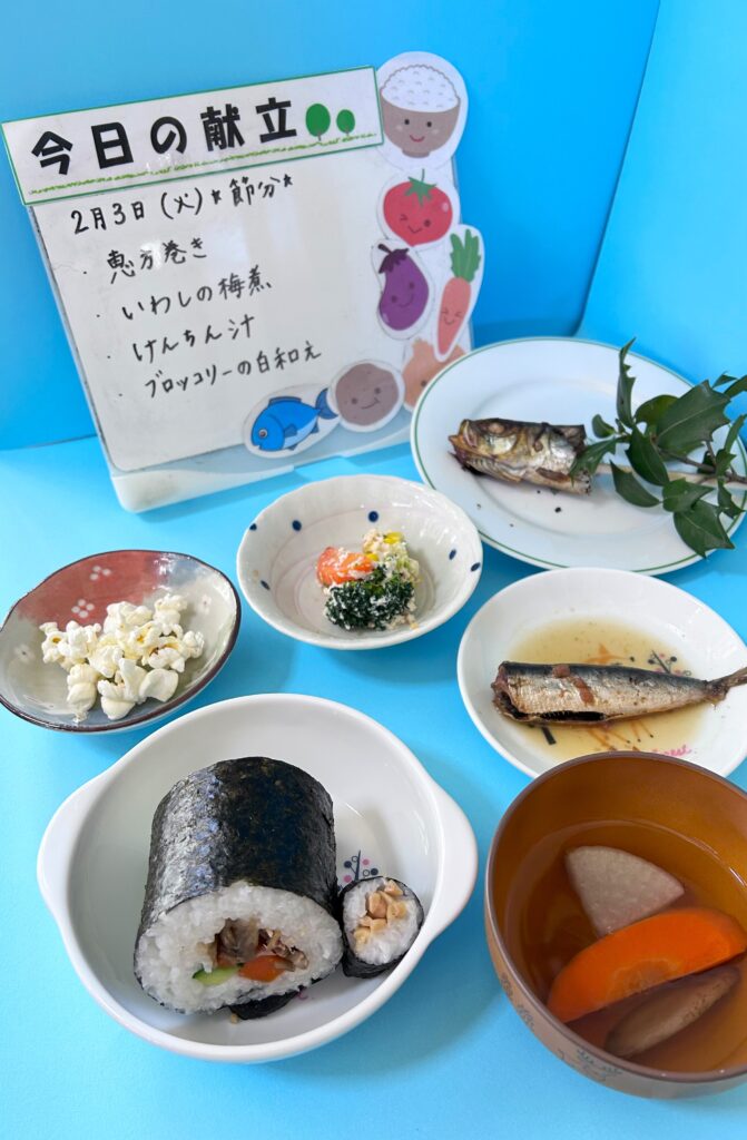 今日は節分特別給食でした。保育園では、鬼の嫌いなヒイラギの枝にイワシの頭を刺した「柊鰯(ひいらぎいわし)」を用意し、子どもたちと一緒に邪気を追い払い、福を呼び込みました!そして今年は、南南東の方向を見て、願い事をしながら、みんなで恵方巻きをいただきました(^^)大きく口を開けて、美味しそうに丸かじりしていました♪