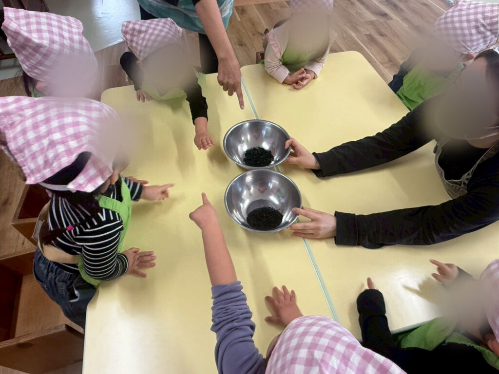 今年も、新米の美味しい季節になりました。今年も、新米をうさぎ組さんに研いでもらい、土鍋で炊いて提供しました。土鍋で炊くと、じっくり熱が伝わる為、お米のでんぷんが分解され、甘味や旨味の成分になります。その美味しさが分かったのか、いつもは白米が苦手な子も、おかわりして食べていました(^-^)
