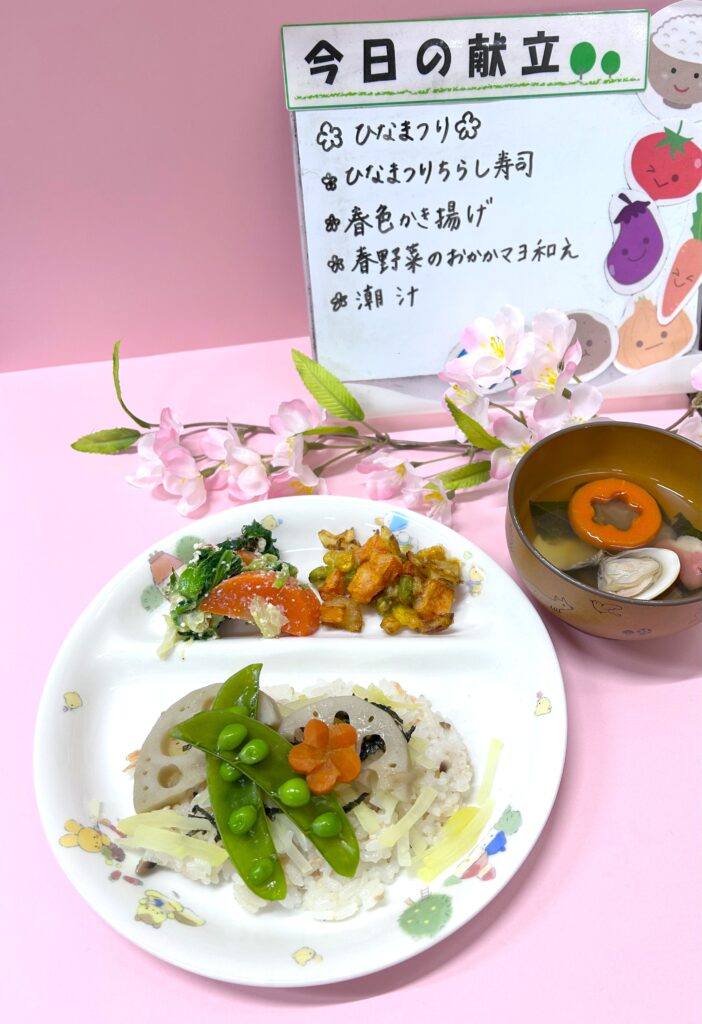 今日は、おひなまつり特別給食でした🎎今年のメインは、ひなまつりちらし寿司です!焼き鮭や胡麻を混ぜた寿司飯の上に、たくわん、スナップエンドウ、梅人参、蓮根などを散らしました。今年は飯台に盛り付けて、クラスごとに盛り付けも楽しんでもらいました!また、春色の野菜をたくさん使った春野菜のおかかマヨ和えや、春色かき揚げ、はまぐりの潮汁を美味しくいただきました。たくさん食べて、お腹いっぱいの子どもたちでした♫