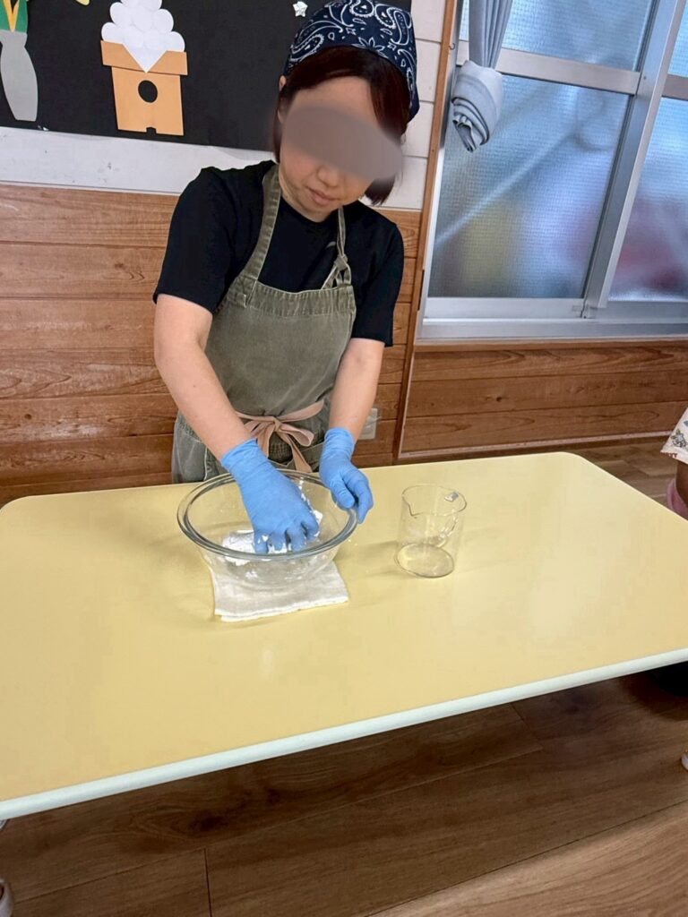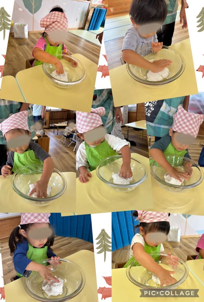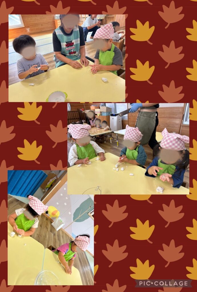 そして、うさぎ組さんは10月の食育も兼ねているのでエプロンと三角巾をつけてお団子作りスタート!