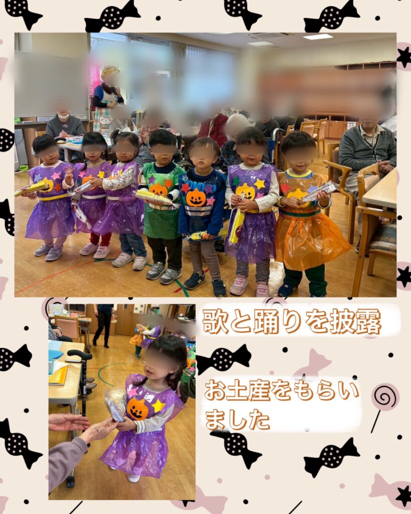 可愛い衣装で歌や踊りを披露しました!おじいちゃんおばあちゃんたちから新幹線の紙のおもちゃをいただき、大喜びな子どもたちでした!