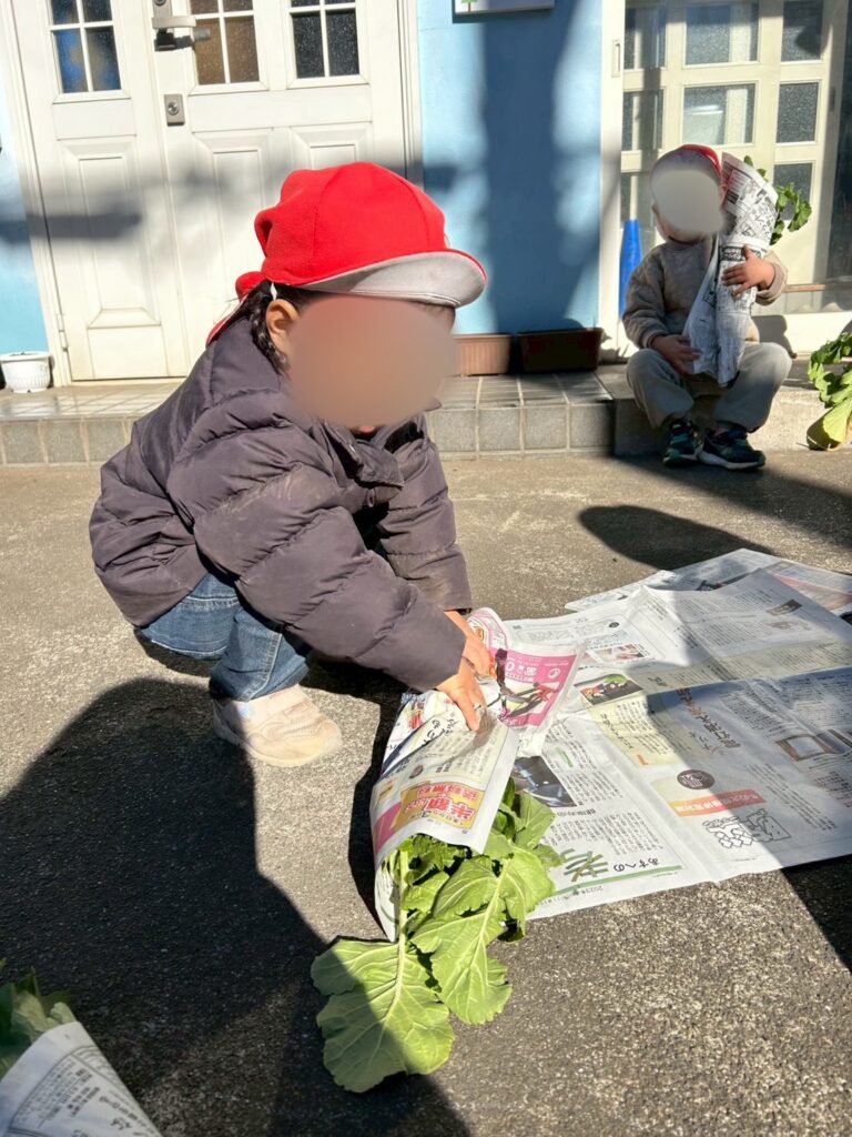 自分で収穫した大根は、それぞれ新聞紙に包んでお土産にしましたー