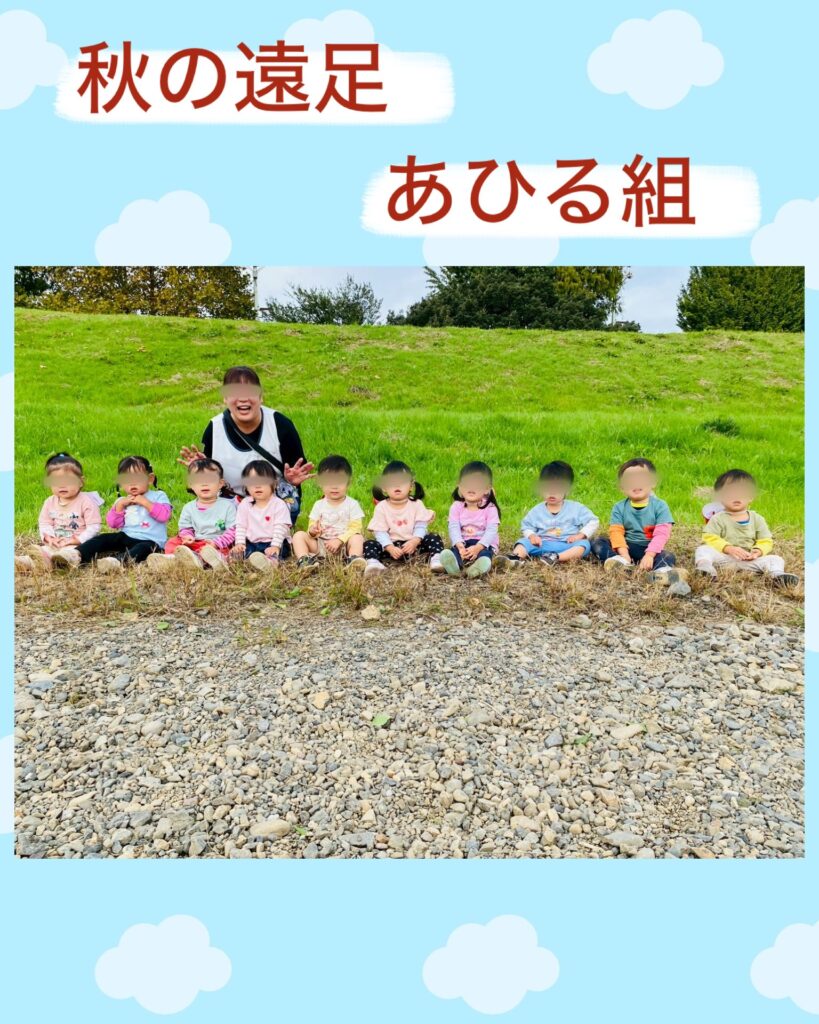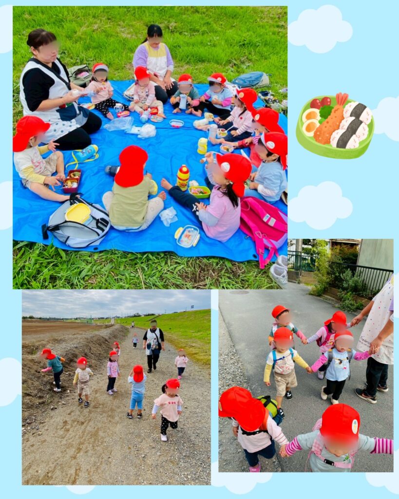 1歳児あひる組さんは、大好きな仲間と気持ち良くお外でお弁当を食べよう!という目的で秋の遠足は土手へ行ってきました!
