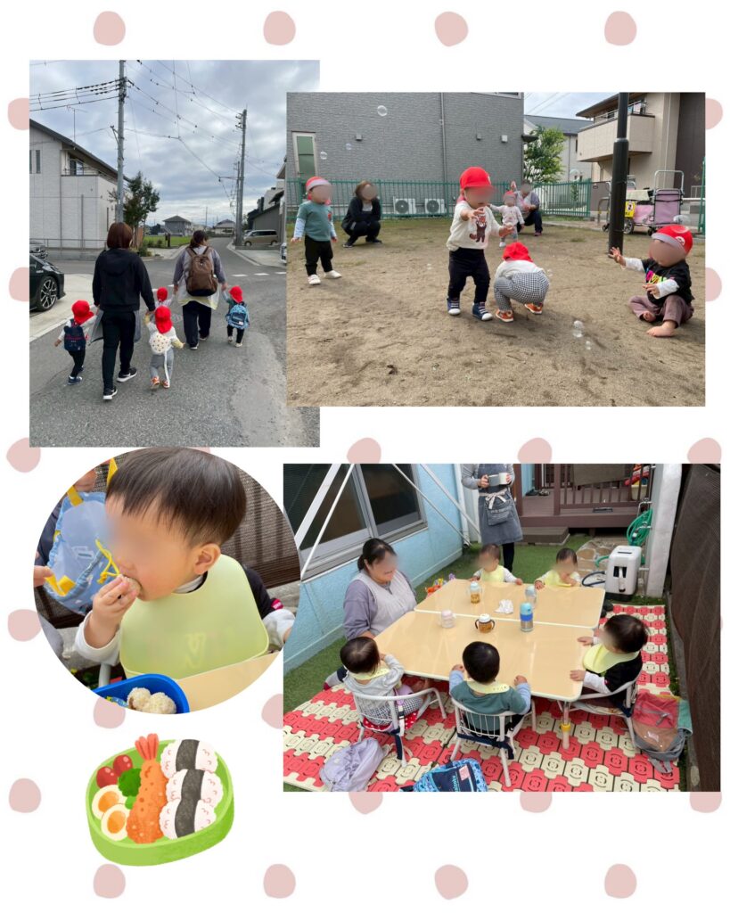 保育園に戻ってきて、園庭でお弁当の時間🍙