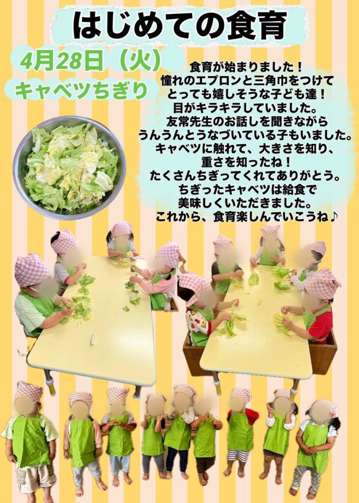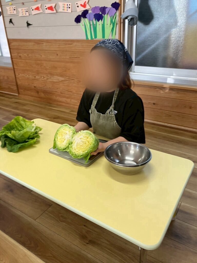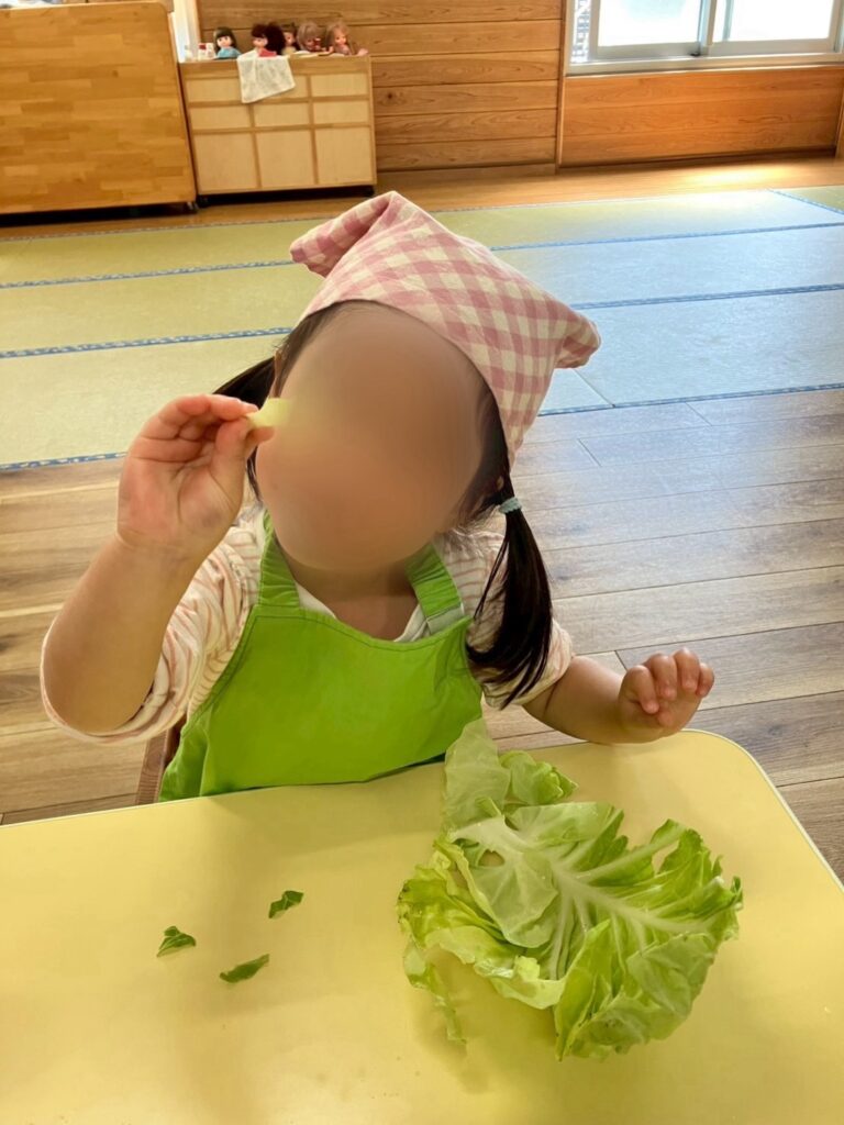 今年度、うさぎ組さんはじめての食育をしました。今月は、キャベツちぎりです。