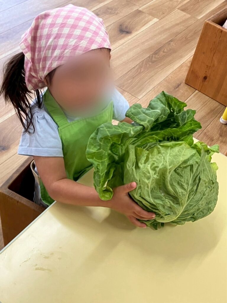 キャベツを持ち上げてみると、「重たいね」「大きいね」と呟く子ども達。